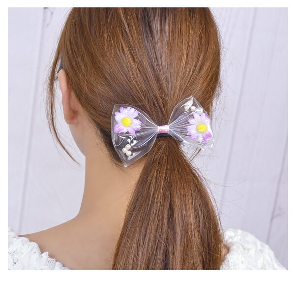 - 【20170711UP】,アクセサリー,原宿,ファッション,パーツ,ヘアゴム,りぼん,リボン,花,フラワー,パール,ヘアアクセサリー,ヘアアクセ,クリア,ビニール素材,ドット,水玉,プール,海,ホワイト,白,白い,パープル,紫,イエロー,黄色,レディース,