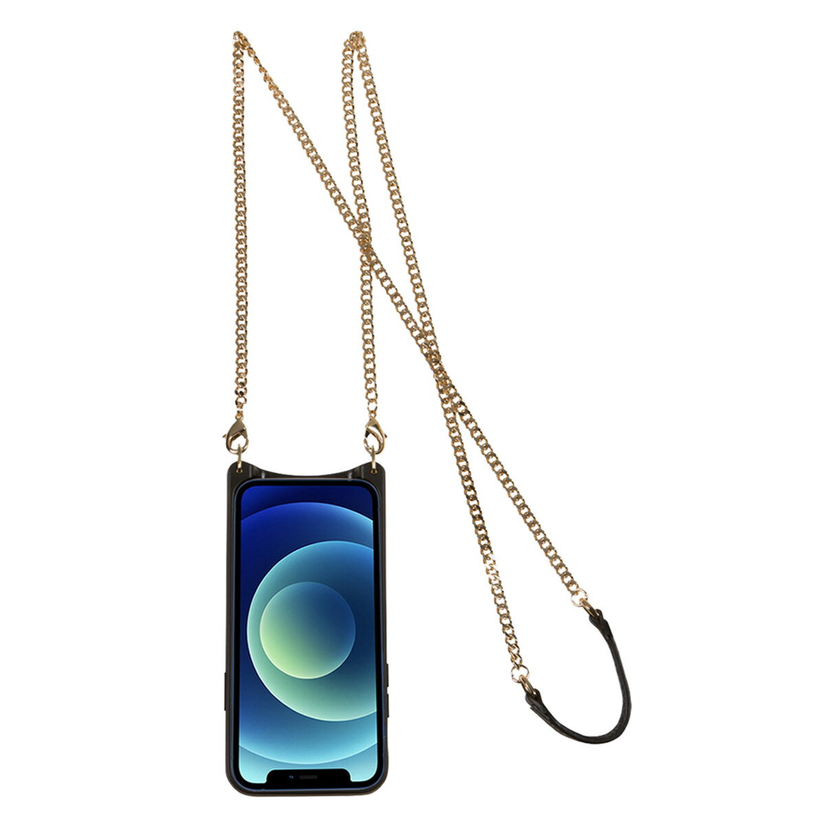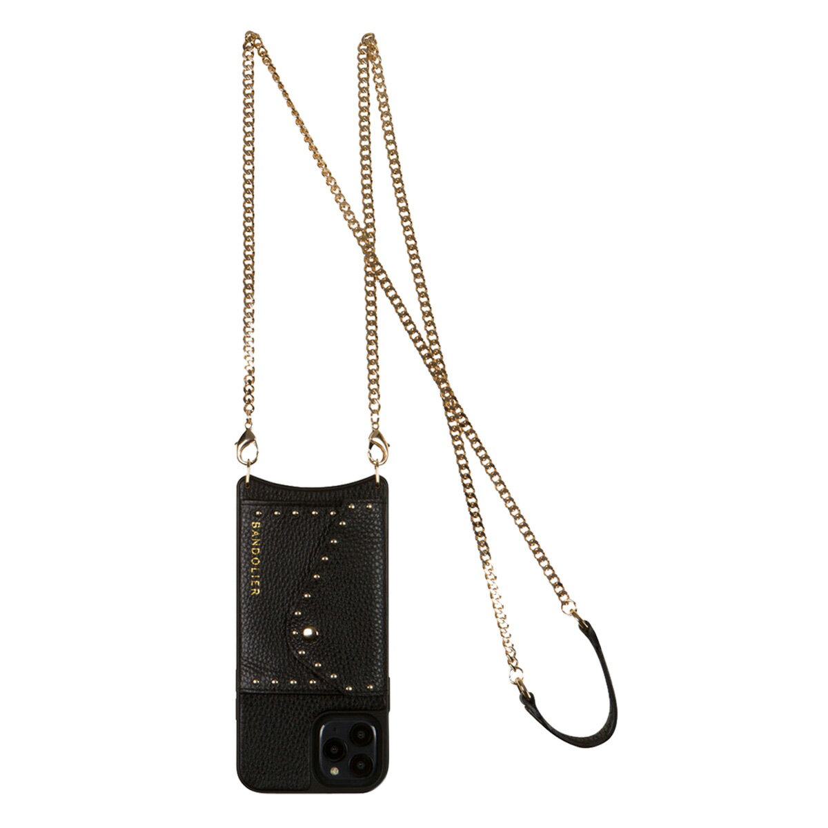 ブラックレザーケース×ゴールドチェーンストラップ×ゴールドの金具を合わせたデザイン。