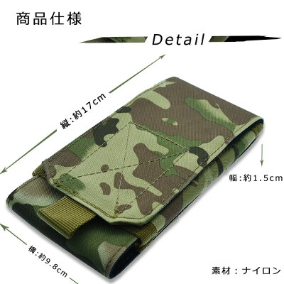 製品 仕様 サイズ Lサイズ 商品特長 ※iPhone XS MAX / XR / XS 6.5インチまでのスマホ対応 ※米軍で開発されたベスト等に弾倉等のポーチ類を 固定する規格 「PALS(Pouch Attachment Ladder System)」に準拠しているので、 バックやリュックにも取り付けが簡単です。